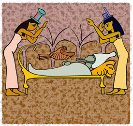 Por medio de magia y ayudada por Neftis reconstruyó el cuerpo de su amado y con los oficios de Anubis lo embalsamó convirtiéndolo en la primera momia de Egipto. El lugar de su entierro definitivo fue guardado con tanto celo que aún hoy se ignora el paradero.