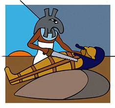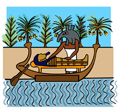 Isis junto a su hijo Horus comenzó de nuevo la búsqueda, montada en una barca de papiros fue reuniendo los pedazos.