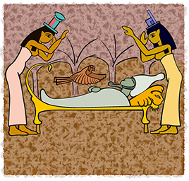 Por medio de magia y ayudada por Neftis reconstruyó el cuerpo de su amado y con los oficios de Anubis lo embalsamó convirtiéndolo en la primera momia de Egipto. El lugar de su entierro definitivo fue guardado con tanto celo que aún hoy se ignora el paradero.