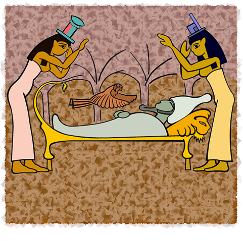 Por medio de magia y ayudada por Neftis reconstruyó el cuerpo de su amado y con los oficios de Anubis lo embalsamó convirtiéndolo en la primera momia de Egipto. El lugar de su entierro definitivo fue guardado con tanto celo que aún hoy se ignora el paradero.